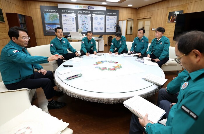 | ▲ 강진원 강진군수(왼 쪽)가 지난 18일 군수실에서 구제역 확산 차단을 위한 방역대책 총력 대응 긴급회의를 주재하고 있다. / 강진군 제공 |