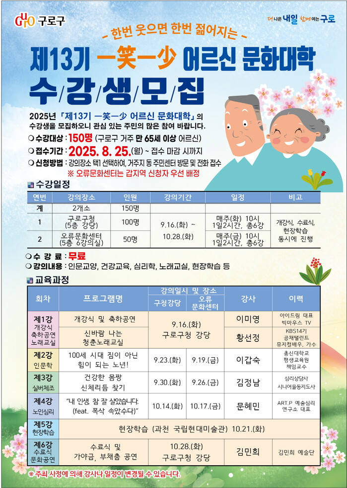 [시민일보 = 박소진 기자] 서울 구로구(구청장 장인홍)가 노인들의 건강하고 활기찬 노후 생활을 위해 ‘제13기 일소일소(一笑一少) 어르신 문화대학’ 수강생을 모집한다고 23일 밝혔다.