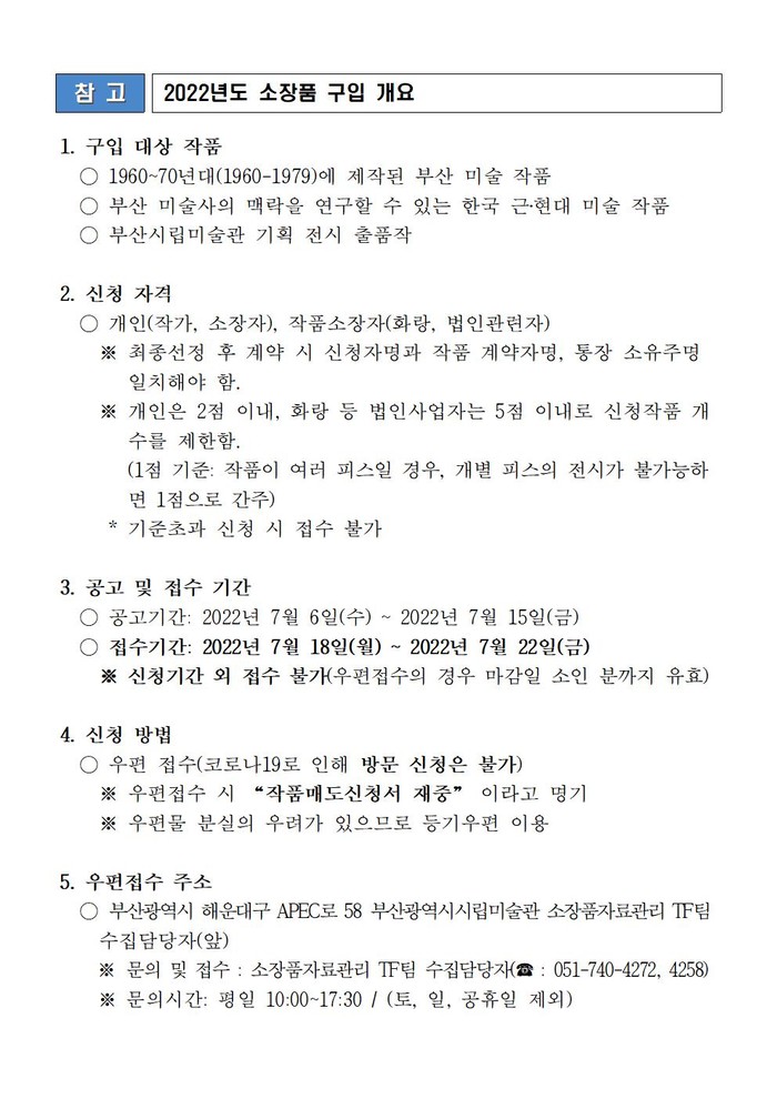 오는 7월 18일부터 7월 22일까지 5일간 작가를 비롯해 개인 소장자, 화랑, 법인 등 누구나 부산시립미술관에 작품 구입을 요청할 수 있다. 다만, 코로나19 예방을 위해 방문 신청은 불가하며, 우편으로만 신청할 수 있다.