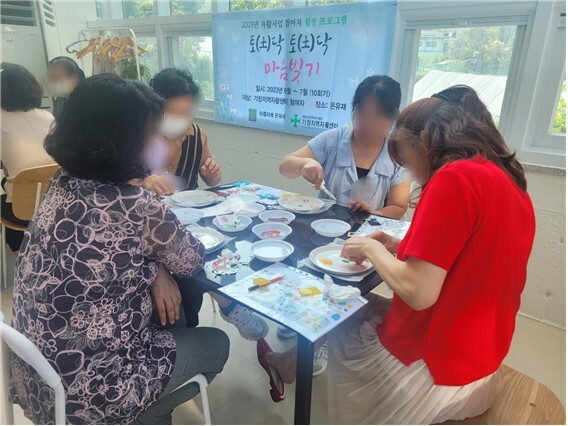 △ 기장지역자활센터 사업단 참여주민들이 함께 모여 접시를 만들기 위해 색지를 오려 꾸미고 있다.