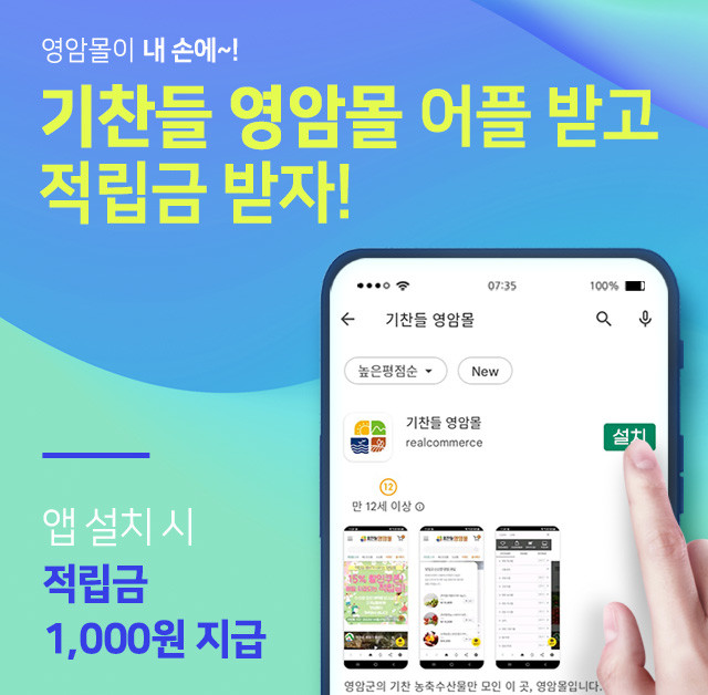 기찬들 영암몰 어플리케이션 및 앱은 이날부터 안드로이드 플레이스토어 및 IOS 앱스토어에서 다운받을 수 있으며, 영암군은 다운받은 고객 전부에게 적립금 1,000원을 지급하는 이벤트를 진행한다.