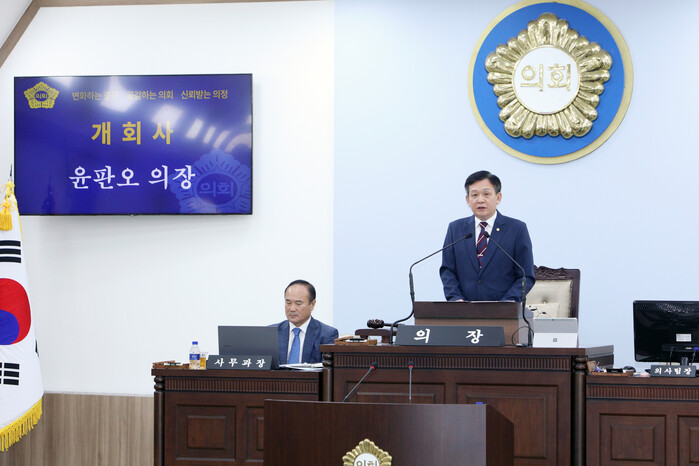 윤판오 의장은 개회사에서 “이번 회기에 제출된 261억원 규모의 추가경정예산안을 면밀히 심사하여, 구민의 삶의 질 향상과 중구의 지속 가능한 발전을 위해 최선을 다하겠다”고 밝혔다.