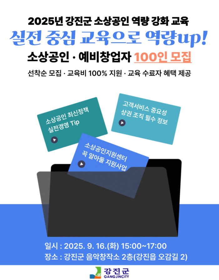 이번 교육은 다음 달 9월 16일 오후 3시부터 5시까지, 강진군 음악창작소에서 진행될 예정으로 개인(소상공인 및 예비창업자)과 단체(상인회 및 예비상인회)로 나눠 신청받으며 총 100명을 선착순으로 모집한다.