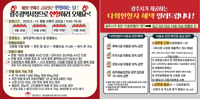 광주시는 올해 9월부터 12월까지 매월 넷째 주 금요일을 ‘헌혈 참여의 날(9.26.금, 10.24.금, 11.28.금, 12.26.금)’로 정하고, 대한적십자사 광주·전남혈액원과 협력해 오전 9시부터 오후 4시30분까지 청사 앞 시민광장에 헌혈버스를 배치·운영한다.