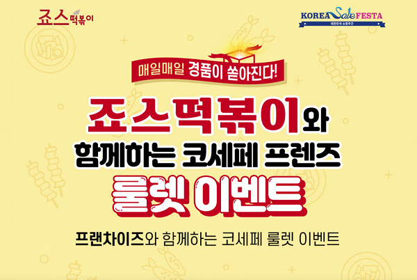죠스떡볶이는 이 기간동안 프랜차이즈 기획전인 '코세페 프렌즈 룰렛이벤트'도 함께 진행해 풍성함을 더했다. 룰렛이벤트 당첨자는 경품으로 죠스떡볶이 모바일 상품권 5종 중 1개를 받을 수 있다. 인기메뉴인 치즈떡볶이와 죠스떡볶이부터 1만원권까지 다양하게 구성됐으며, 당첨된 모바일 상품권은 전국 죠스떡볶이 매장에서 사용할 수 있다.