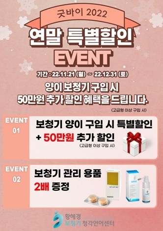 이번 이벤트는 보청기 양이 구입 시 특별할인과 함께 50만원 추가할인 및 보청기 관리 용품 2배 증정 행사이다.