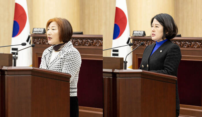 | 안산시의회가 22일 제288회 임시회 제1차 본회의에서 ‘이민청 설치 촉구 건의안’과 ‘이민청 안산 유치 건의안’을 채택했다. 사진 왼쪽이 이민청 설치 촉구 건의안을 대표 발의한 현옥순 의원이고 오른쪽은 이민청 안산 유치 건의안을 대표 발의한 황은화 의원의 모습. 사진제공=안산시의회