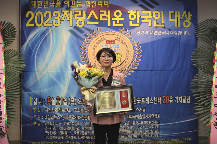 [보성=황승순 기자]보성군의회 문점숙 의원(행정자치위원장)이 지난 21일 서울시 프레스센터에서 열린‘2023년 자랑스러운 한국인 대상’시상식에서 지역사회 발전 공헌 부문 대상을 수상했다.