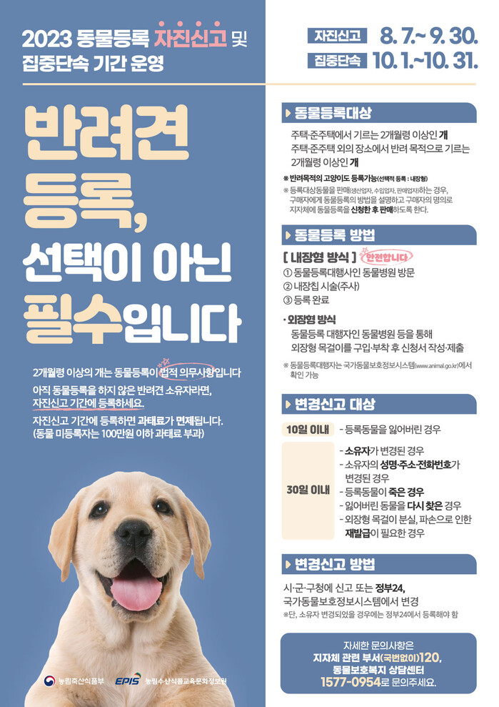 전재영 환경축산과장은 “1천만 반려동물 가족 시대에 동물등록은 선택이 아닌 필수로, 성숙한 반려동물 문화가 조성될 수 있도록 반려인들의 많은 참여를 바란다.”고 말했다.