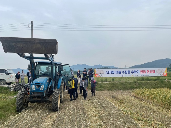 | ▲ 강진군, 지난 20일 작천면 삼당리 마늘 포장에서 수확 노동력 절감 효과를 평가하기 위한 현장 연시회 개최 / 사진=강진군 제공 |