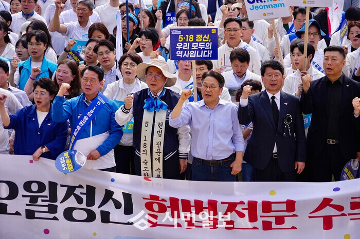민주평화대행진에는 강기정 광주시장과 우원식 국회의장을 비롯해 신수정 광주시의회의장, 이정선 광주시교육감, 김영록 전남도지사, 오영훈 제주특별자치도지사, 광주시 자치구 청장, 국회의원, 5월 공법단체회장, 대학생, 시민 등 1만5000여 명이 참가했다.
