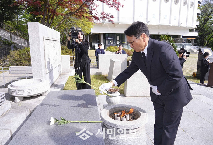 | ▲ 강기정 광주광역시장이 제65주년 4.19혁명 기념일인 19일 오전 동구 광주공원 내 4.19혁명기념탑에서 헌화 하고 있다. /광주광역시 제공 |