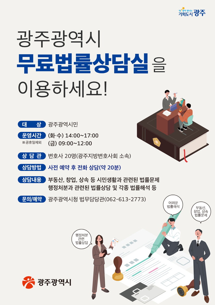 상담을 희망하는 광주시민은 법무담당관실로 전화해 예약하면 된다.