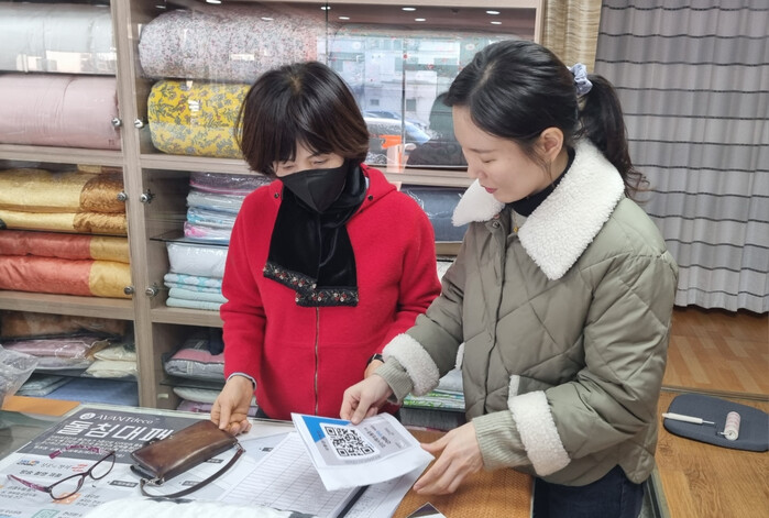 | ▲ 강진군 모바일 착 업무 담당직원이 강진읍 한 상가를 찾아 모바일 강진사랑상품권 가입 안내를 하고 있다. / 강진군 제공 |