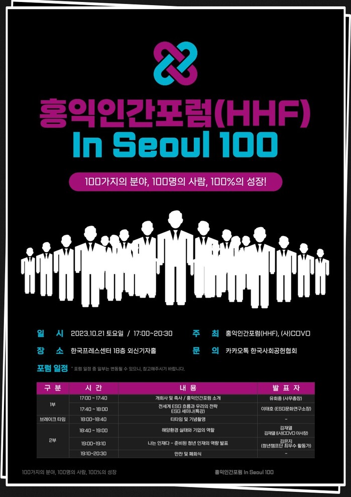 한국사회공헌협회가 주관하고 홍익인간포럼과 (사)COVO가 주최하는 '홍익인간포럼 In Seoul 100' 행사가 10월 21일, 한국프레스센터 18층 외신기자홀에서 개최된다. 이번 행사는 ㈜루멘그룹(대표 김인환)의 공식 후원을 받고 있으며, '100개의 분야, 100명의 사람, 100%의 성장' 슬로건 아래 '상생'을 주제로 진행된다.