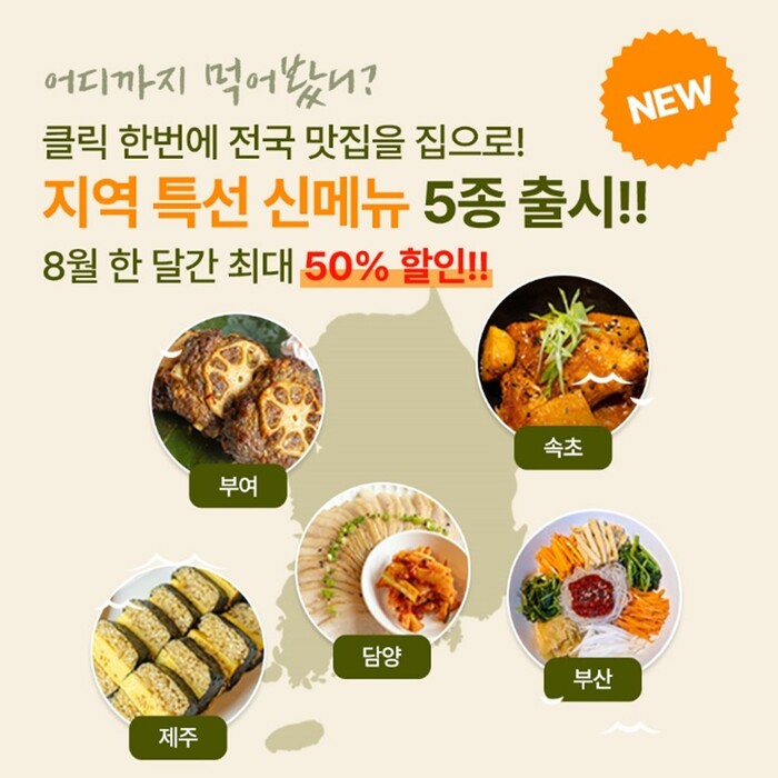 새로이 출시된 지역 특선 메뉴 5종은 각 지역을 대표하는 음식들로 구성되었다. 대나무의 고장 담양의 ‘[담양] 죽순무침 항정살 냉수육’, 연꽃 축제로 유명한 부여의 ‘[부여] 연근 떡갈비’, 속초의 명물 ‘[속초] 가오리 조림’, 깡통 시장에선 꼭 맛봐야 한다는 ‘[부산] 울외장아찌 비빔당면’ 그리고 제주도 하면 너무나도 유명한 ‘[제주] 전복 김밥’ 총 5종이다.