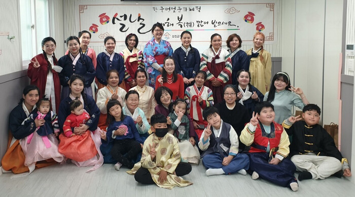 | ▲ 강진군가족센터, 다문화가족 설맞이 체험행사 참여자 기념촬영 / 강진군 제공 |