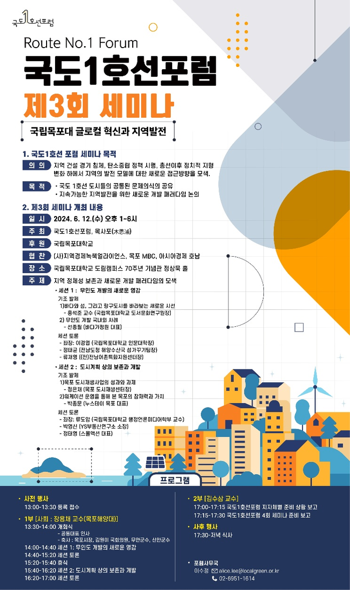 [무안=황승순 기자]국립목포대학교(총장 송하철)는12일(수) 13시 30분에 국립목포대 70주년기념관 정상묵홀에서 ‘국립목포대 글로컬 혁신과 지역발전’ 국도1호선포럼 제3회 세미나를 개최한다.