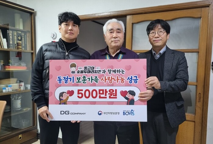 [부산=최성일 기자] 국가보훈부 부산지방보훈청(청장 전종호)은 지난 11일 오후 3시 ㈜디지컴퍼니(대표 이동근) 동근이숯불두마리치킨의 후원으로 동절기 보훈가족 사랑나눔 성금 500만원 전달식을 가졌다.
