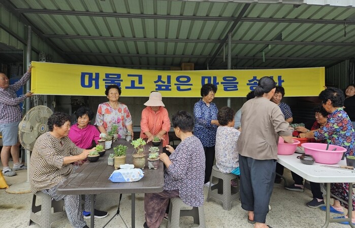| ▲ 서호면 송산경로당 어르신, 지난 17일 다육 화분 공동제작 작업 / 영암군 제공 |