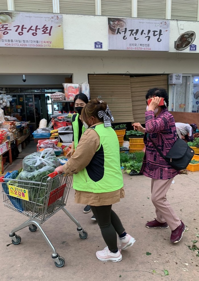 | ▲ 강진읍 전통시장(5일장)에서 상품을 구입한 지역민의 구입물품 운반을 도와 주고 있는 도우미 / 사진=강진군 제공 |