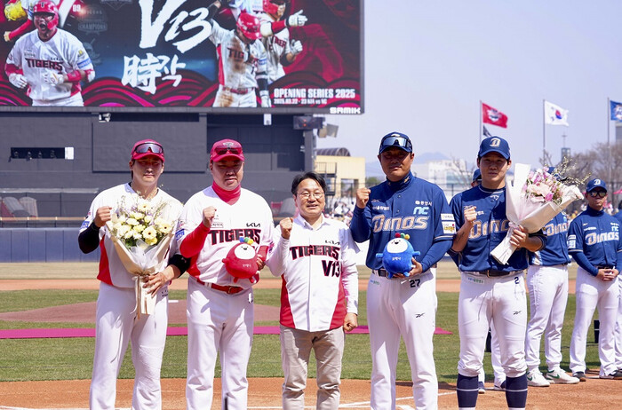 [광주=정찬남 기자] 강기정 광주광역시장(사진 가운데)이 지난 22일 오후 광주KIA챔피언스필드에서 열린 KIA 타이거즈와 NC 다이노스의 홈개막전에 참석해 KIA 이범호 감독, NC 이호준 감독에게 오매나 인형을 증정한 뒤 기념촬영을 하고 있다./광주광역시 제공