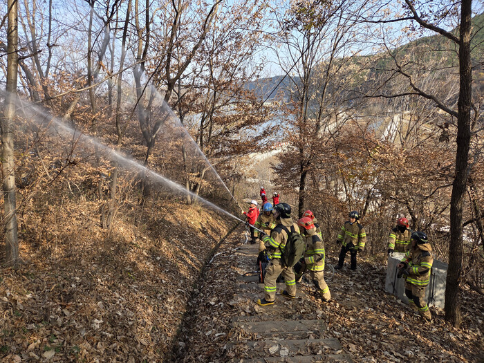 이날 훈련은 방화 의심 산불이 등산로 2곳에서 동시에 발생한 상황을 가정해 진행됐으며, 초기 진화, 방어선 구축, 이동식 소화수조 운영, 드론을 활용한 화선 파악 등 실전 대응 절차 전반이 수행됐다.
