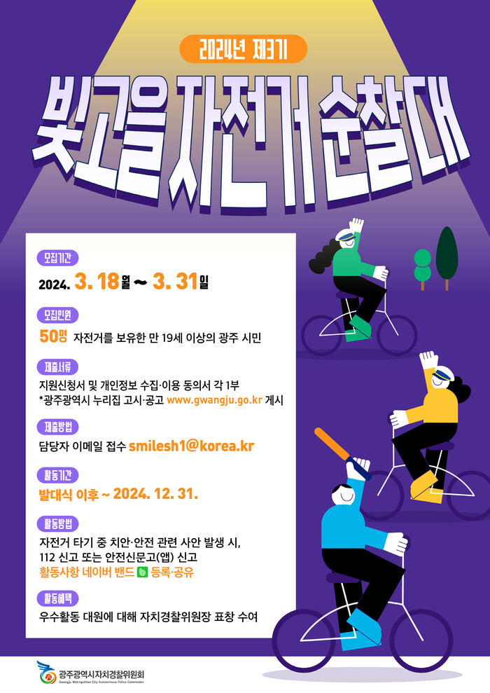 제3기 순찰대 모집 기간은 오는 18일부터 31일까지이며, 서류 심사를 거쳐 50명을 선발한다. 자전거를 보유한 19세 이상 광주시민이면 누구나 지원할 수 있다. 지원자는 광주시 누리집 고시·공고 또는 광주자치경찰위원회 누리집에서 신청서를 내려받아 작성한 후 이메일로 제출하면 된다.