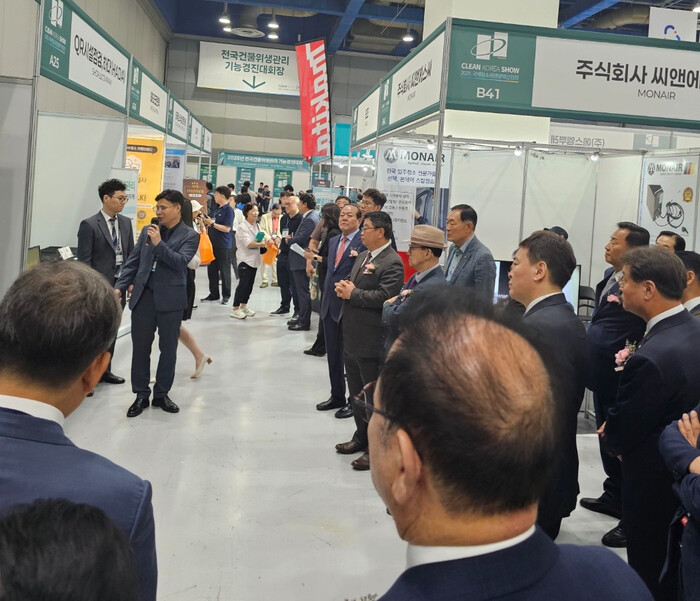| ▲ 2025 국제청소위생방역산업전 개막식 현장, 주요인사들이 전시장 흡연부스를 참관 중이다. |