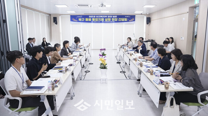 | ▲ 강기정 광주광역시장(오른 쪽부터 5번 쨰)이 지난 6일 오후 정은경 보건복지부 장관과 함께 북구 오치복합커뮤니티센터에서 열린 '돌봄 통합지원 실행 현장간담회'에 참석해 시·5개 자치구, 건강보험공단 등 돌봄 관계자들과 의견을 나누고 있다./광주광역시 제공 |