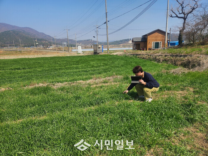 | ▲ 강진군청 축산과 직원이 태블릿 PC를 이용해 조사료 파종필지 일제조사를 하고 있다 / 강진군 제공 |