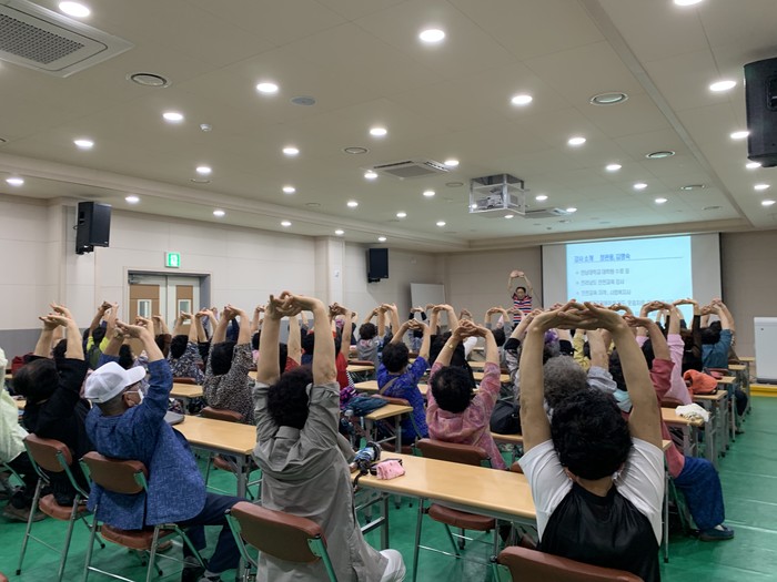 | ▲ 강진군 관내 어르신일자리 참여자들이 지난 20일 청소년문화의집 대강당에서 안전교육 중 건강한 신체유지를 위한 교육을 수강하고 있다. / 사진=강진군 제공 |