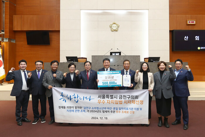 [시민일보 = 여영준 기자] 서울 금천구의회가 법제처 주관 ‘2024년 우수 자치입법 활동 지자체 선정’ 기초부문에서 장려상을 수상했다.