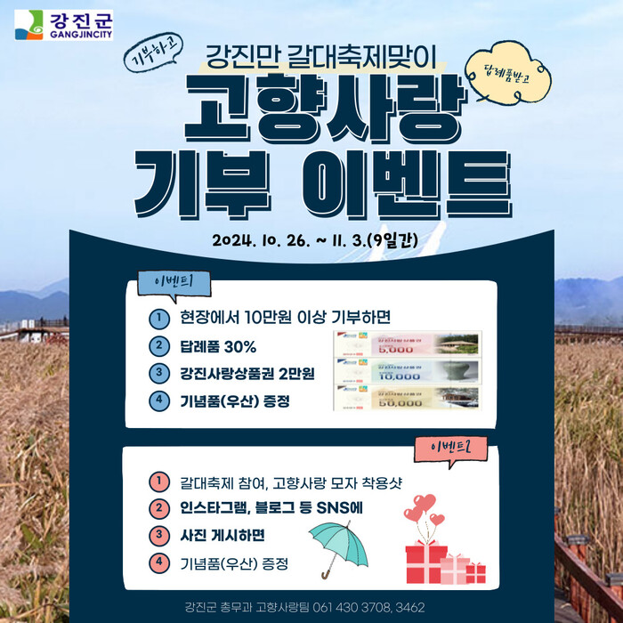 고향사랑기부제 이벤트는 행사장 내 부스에서 진행되며, 기존 3만 원 상당의 답례품에 더해 강진사랑상품권 2만 원과 우산 등 추가 기념품을 증정하는 현장 기부 이벤트와 SNS 인증 이벤트 등 참여자에게 풍성한 혜택이 제공될 예정이다.