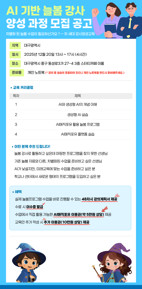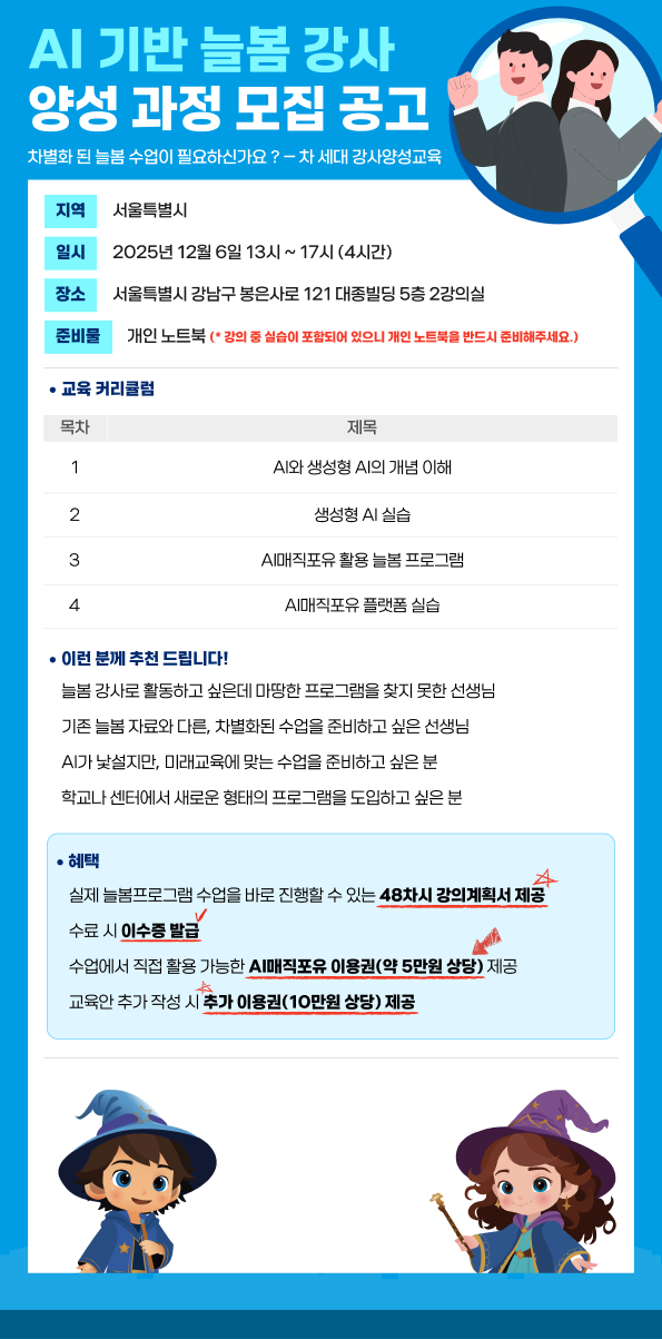 교육 커리큘럼은 다음과 같이 구성된다. ▲ AI·생성형 AI 개념 이해 ▲ 프롬프트 엔지니어링 기초 ▲ 다양한 생성형 AI 서비스 체험 ▲ 프롬프트의 중요성 및 AI 윤리 교육 ▲ AI매직포유 활용 늘봄 수업 이해 ▲ 글쓰기·그림·숏폼·노래·동화 만들기 실습 교육 수료자에게는 실제 늘봄 프로그램 수업을 바로 진행할 수 있는 48차시 강의계획서, 이수증, AI매직포유 이용권(약 5만원 상당)을 제공한다고 한다.