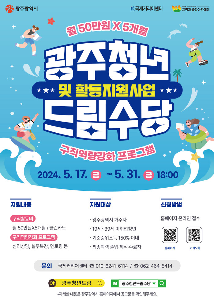 신청은 17일부터 31일까지 광주청년드림수당 공식사이트에서 하면 된다. 광주시는 지원 신청자의 가구 소득, 미취업 기간, 구직활동계획서를 심사해 대상자를 선발하고 6월 27일 광주시 누리집에 공개하고 문자메시지를 통해 개별 통보할 예정이다.