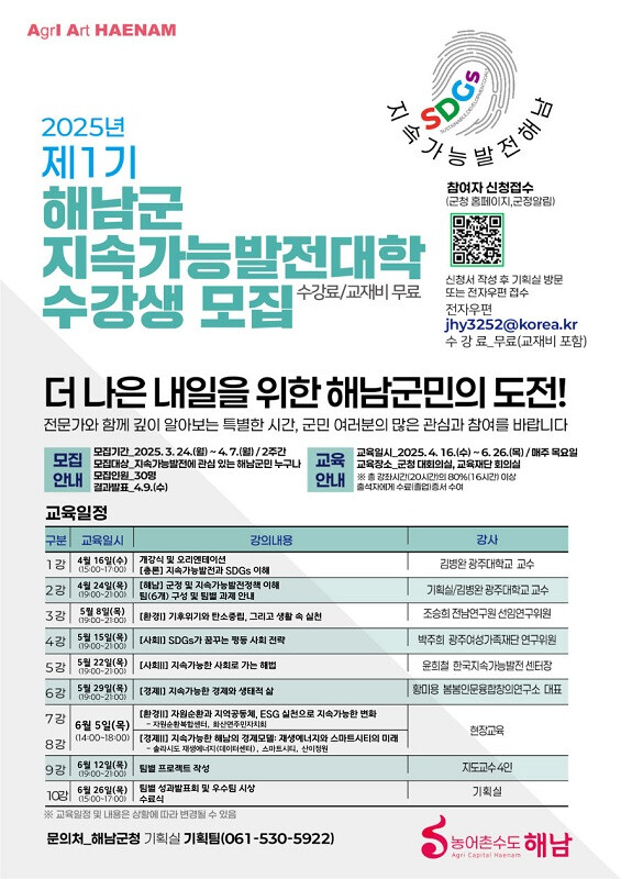 제1기 해남군 지속가능발전대학의 수강생은 다음 달 4월 7일까지 모집한다.