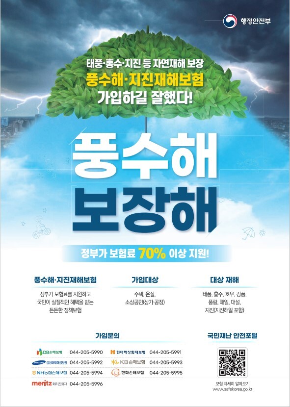 박남주 시민안전실장은 “이번 법률 시행으로 풍수해‧지진재해보험의 피해 보상 범위가 명확해졌다”며 “풍수해‧지진재해보험의 보험료 일부를 국가에서 지원하고 납부 보험료 대비 보상 혜택이 큰 만큼 풍수해, 지진 등 취약 지역에 거주하는 주민은 적극 가입해달라”고 당부했다.