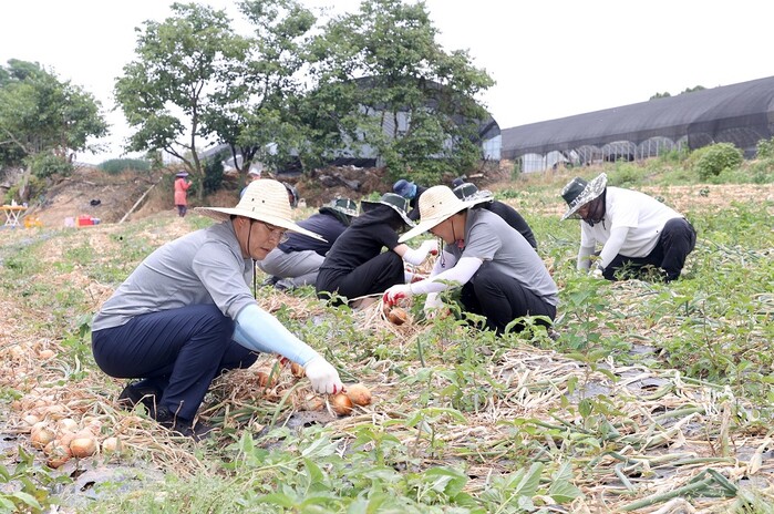 농번기 농촌 노동력 부족을 해소하기 위해 나선 우승희 영암군수를 포함한 공직자들은, 이날 더운 날씨에도 양파 농가가 결실의 기쁨을 누릴 수 있도록 도왔다.