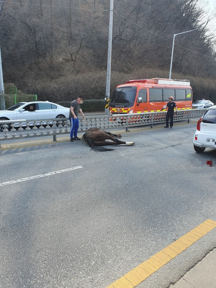이날 강변도로 도로변에 말4마리가 역주행 하고 있다는 신고가 접수되어 소방본부는 구조장비 등을 이용하여 인근 oo승마클럽에서 탈출한 말3마리를 포획하고 1마리는 이곳을 지나는 그랜져 차량과 충돌하여 현장에서 사망했다.