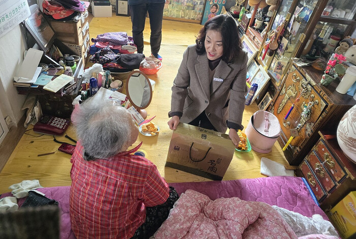 | ▲ 하혜성 영암군 주민복지과장이 지난 20일 국가유공자 유족의 집을 찾아 위문품을 전달하고 있다. / 영암군 제공 |