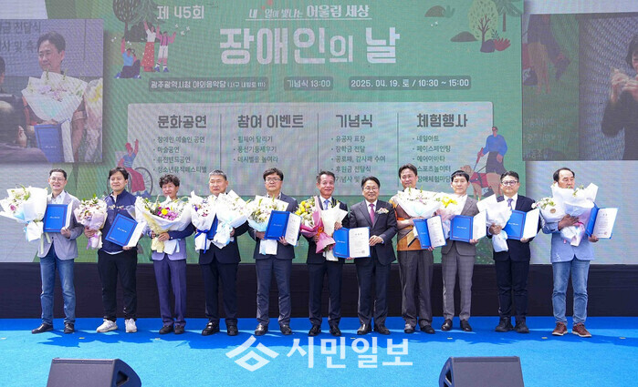 | ▲ 강기정 광주광역시장(오른 쪽부터 다섯 번째))이 19일 오후 시청 야외음악당에서 열린 '제45회 장애인의 날 기념식'에 참석해 내빈들과 기념촬영을 하고 있다./광주광역시 제공 |