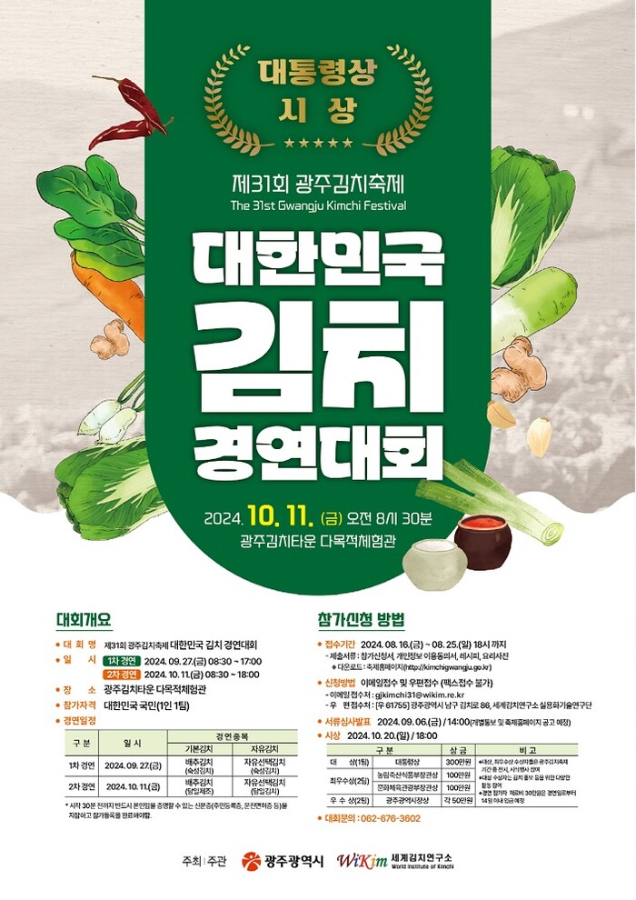 남택송 농업동물정책과장은 “다양한 참가자들이 대한민국 김치 경연대회에서 김치의 전통과 창의성을 발휘할 수 있는 기회가 되길 바란다”며 “김치에 대한 관심과 인식을 높이는 계기가 되기를 기대한다”고 말했다.