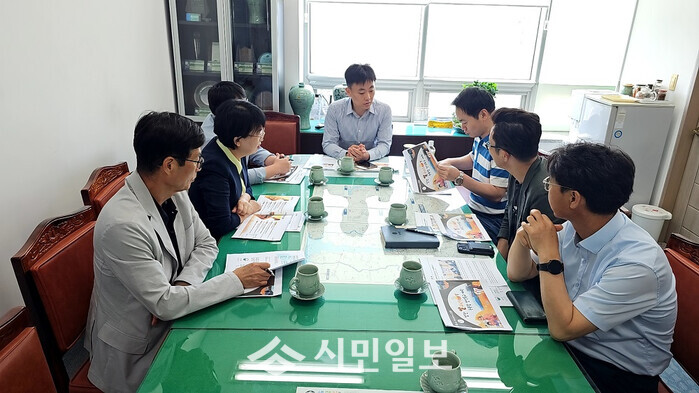 | ▲ 강진군농업기술센터를 방문한 식품회사 관계자가 강진산 쌀귀리쌀보리 생산 자료 등을 살펴보고 있다. / 강진군 제공 |
