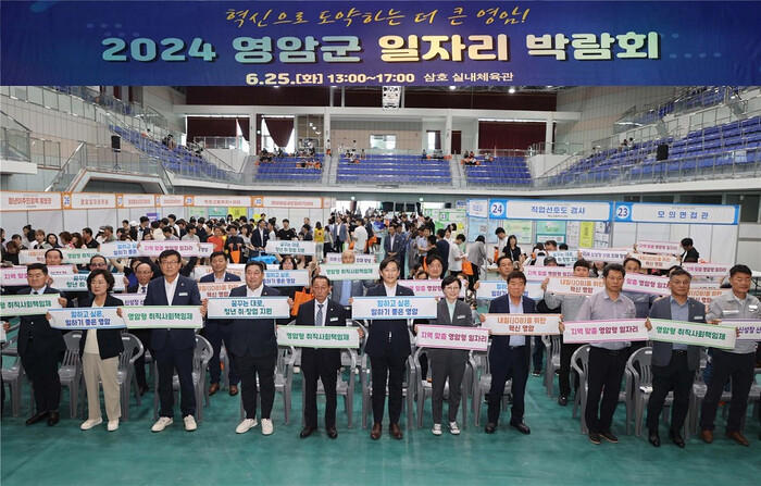 | ▲ 우승희 영암군수(사진 앞줄 가운데)가 지난해 6월 25일 삼호읍 소재 실내 체육관에서 열린 2024 영암군 일자리박람회에 참석한 군의회 의원, 내빈 등과 '일하고 싶은, 일하기 좋은 영암' 문구 피켓 퍼포먼스를 하고 있다. / 영암군 제공 |