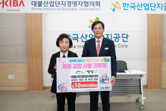 [영암=정찬남 기자] 대불산단경영자협의회(회장 유인숙)가, 지난 10일 한국산업단지공단 전남서부지사에서 영암군에 고향사랑기부금 1,000만 원을 기부했다.