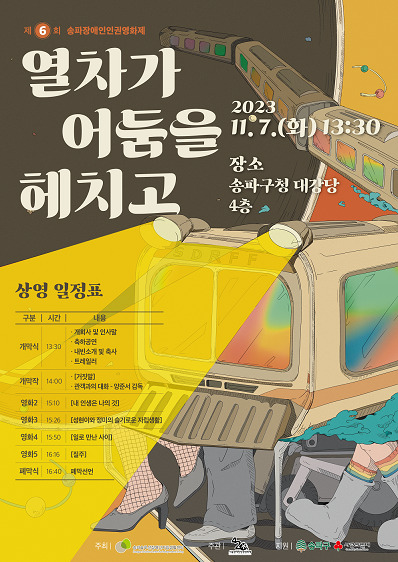 ‘제6회 송파장애인인권영화제’는 장애인 공공일자리 참여자들의 축하공연으로 막을 연다. “열차가 어둠을 헤치고”라는 주제로 서로 다른 유형의 장애인들이 가지고 있는 어려움과 차별 요소를 인권의 관점에서 바라보는 장?단편의 다큐 및 영화 5편을 상영한다.