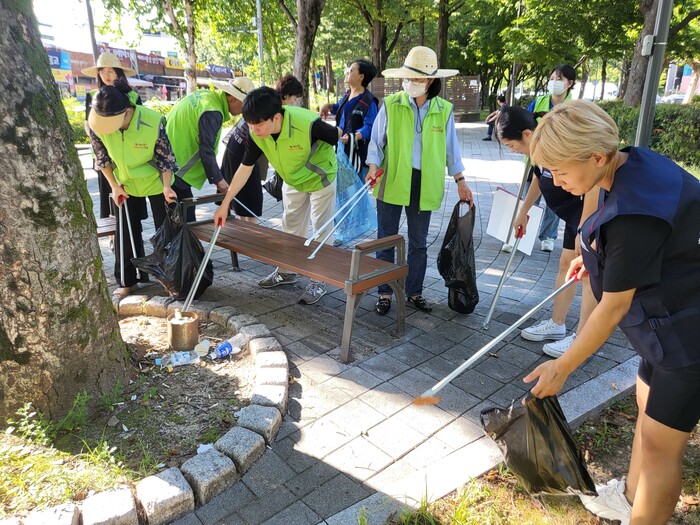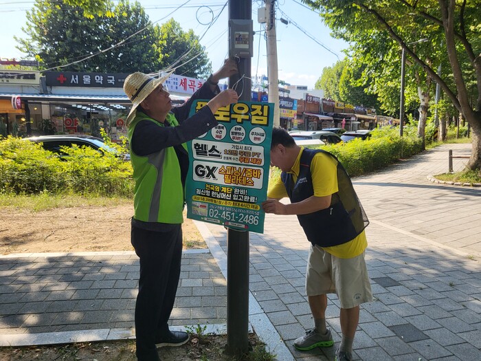 이번 활동에는 자유총연맹 회원과 주민센터 직원 등 15명이 참여했다. 참가자들은 상가 밀집 지역과 근린공원을 돌며 바닥에 떨어진 쓰레기를 줍고, 사전 신고 없이 설치된 현수막·배너 등 불법 광고물을 수거했다.