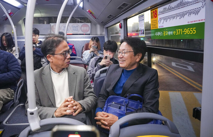 | ▲ 강기정 광주광역시장이 '대자보 도시(대중교통, 자전거, 보행 중심)도시 광주 실현'을 위해 지난 11월 11일 오전 북구 문흥동 자택에서 시청까지 버스를 타고 출근하며 시민과 대화를 하고 있다. / 광주 출근 챌린지 실천 자료사진 = 광주광역시 제공 |