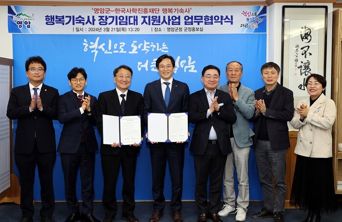 [영암=정찬남 기자] 전남 영암군(군수 우승희)이 한국사학진흥재단 행복기숙사와 지난 21일 군청에서 ‘행복기숙사 장기 임대 지원사업 업무협약’을 체결했다.